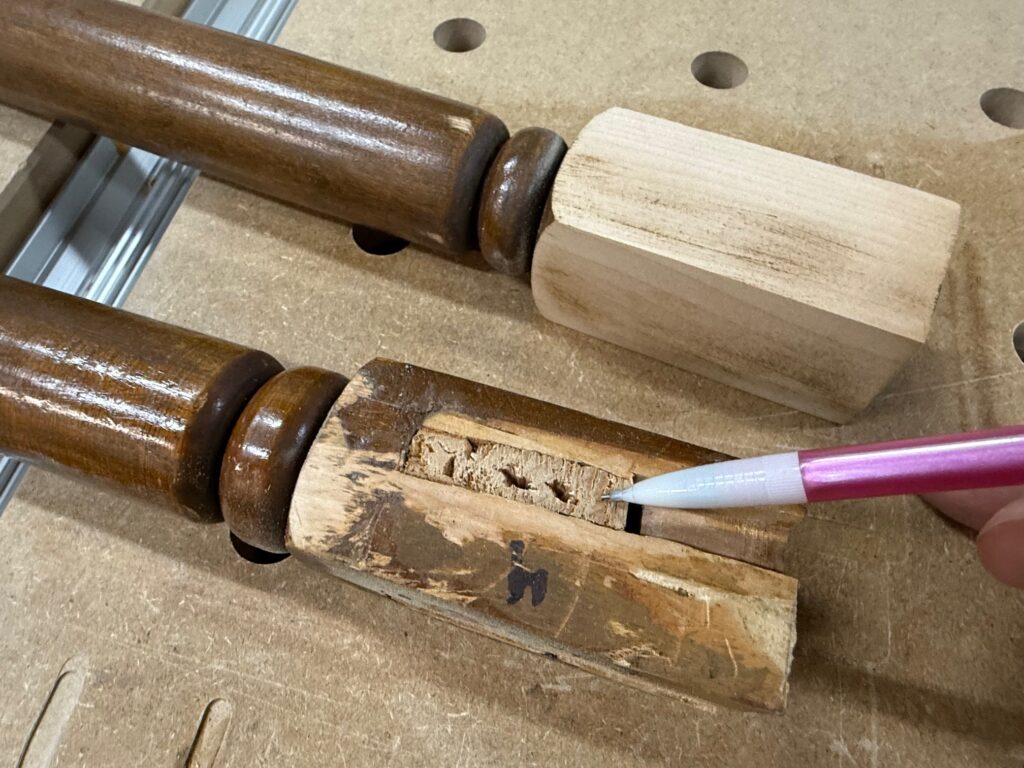 I sliced the bench surface down the middle, cleaned up what I could of the dipping and warping, providing as flat a surface as I could expect to get while maintaining most of the slab’s thickness. After cleaning up some wear areas, some broken sections, and reassembling the slab and putting it aside, I turned to the frame. Several of the joints were weakened and loosened over time, and some had been repaired with various screws and other fixes. With some work and great care, we got all the joints apart, and discovered the front legs simply weren’t usable; too many repairs, too many holes and screws, too many thisses-and-thats over the last century. And some of the wood around the broken tenon was spongy and cracked. I guess it took on some moisture some time in the past and the wood took too long to dry out before some rot set in.